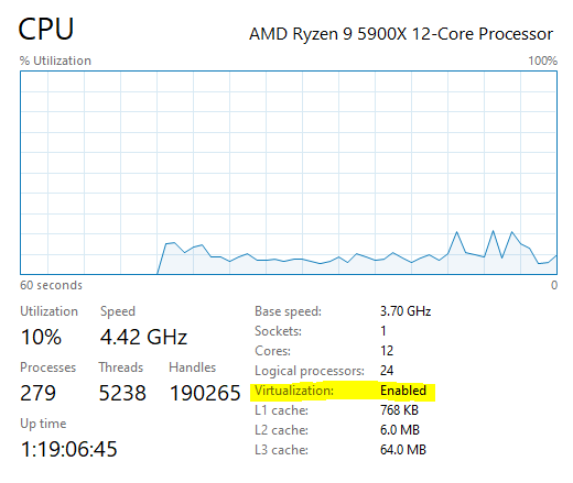 If you get an error about enabling virtualization, you’ll need to reboot into your computer’s BIOS settings and enable virtualization. You can check if virtualization is enabled in Task Manager > Performance > CPU: