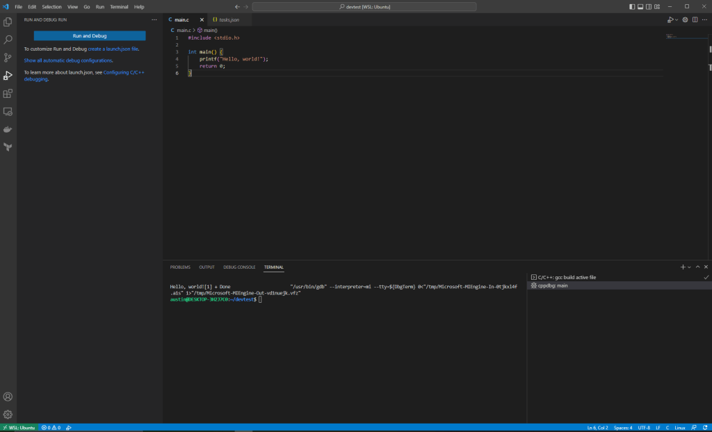 This task will use our WSL gcc executable to compile our C source files into object files so we can run them. Let’s create a simple main.c in the root of our devtest project to test with: